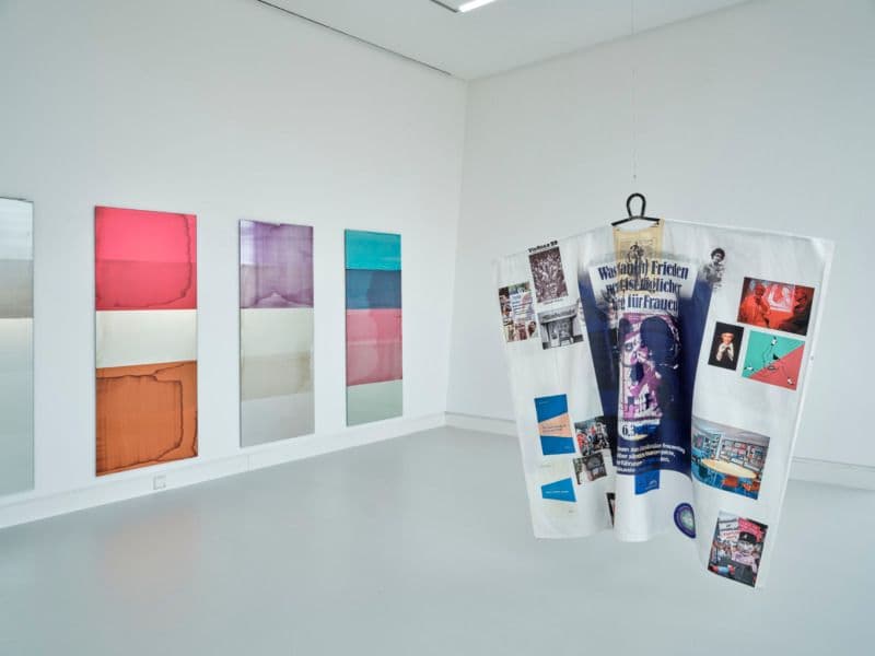 Installationsansicht Kunsthalle Mainz: Philipp Gufler: Dis/Identification: Philipp Gufler, Kostüm Performance Kakaduarchiv II, 2022; 7 Spiegelarbeiten, 2016-2023