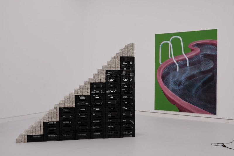 Philipp Nessler Potemkin, 2020, Beton, Gemüsekisten, 300 x 65 x 250 cm; Kara Hondong purple prose, 2021, Malerei, Öl, Wachs, Greenscreenfarbe auf Leinwand, 300 x 240 cm. Foto: Danijel Sijakovic