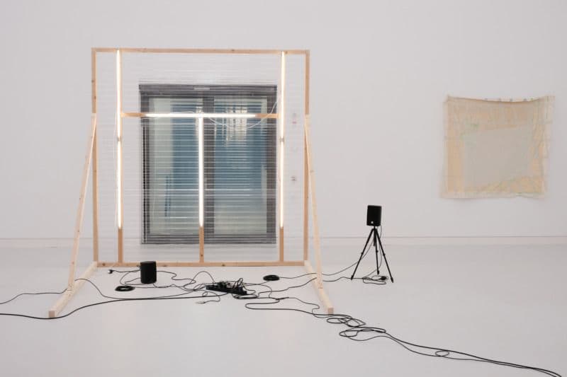 /POKY (Julia Gerke / Alina Röbke) artists must be spiders, 2021, 4-Kanal-Audio, 100 Min., POKYMusterfrontseite (Holz, Acryltrapezplatten), Rahel Sorg o. T., 2020 Baumwollgewebe, Acryl, Öl, Sprühlack, ca. 170 x 185. Foto: Danijel Sijakovic