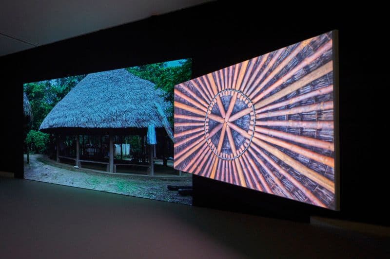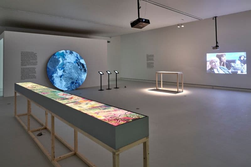 Installation view: Ursula Biemann & Paulo Tavares: Forest Law, 2014, two-channel video installation, maps, documents, objects, publications, dimensions variable, Courtesy Ursula Biemann, Paulo Tavares, photo: Norbert Miguletz
