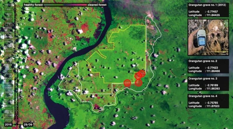 Forensic Architecture: Ecocide in Indonesia. The expansion of plantations into forests in Indonesia has led to the killing of orangutans and the destruction of their habitats. This map shows the location of five orangtuan grave sites around the Bumi Langg
