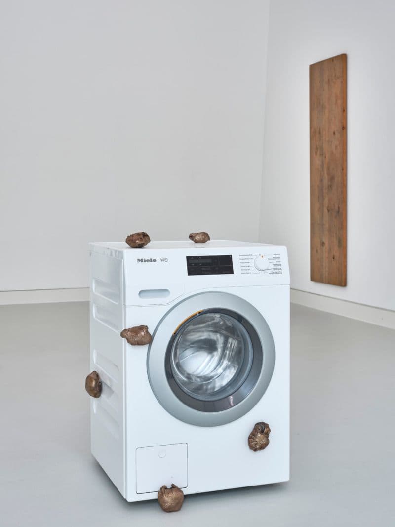 Installationsansicht: Benedikte Bjerre: Libero (eat, pray, love), 2021, industriell hergestellte Objekte (Waschmaschine, Tischplatte), 21 Bronzegüsse, Courtesy the artist. Foto: Norbert Miguletz