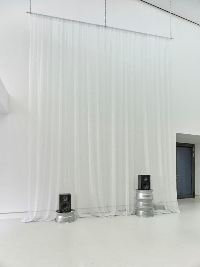 Installationsansicht: Samantha Bohatsch: SWM, 2020, verschiedene Medien, Aluminiumstange, Ketten, Alufelgen, Zwei-Kanal-Sound-Installation, 3:32 Min., Courtesy the Artist. Foto: Norbert Miguletz