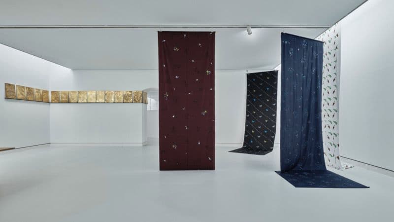 Installationview: Kunsthalle Mainz: Unextractable: Sammy Baloji invites: Sammy Baloji, embossed copper plates, 2025 Nilla Banguna: Wankito (umwanakaji). La femme forte, 2023, printed fabrics, Photo: Norbert Miguletz