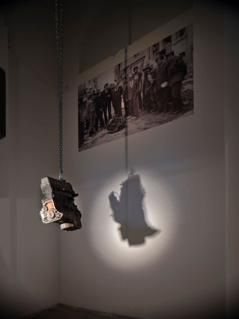 Installation view: Walid Raad: My neck is thinner than a hair: The Benz, 1988-2022, Mercedes Benz engine, non-woven wallpaper, 307 cm x 184 cm, Courtesy the artist and Sfeir-Semler Gallery, Beirut/Hamburg, Photo: Norbert Miguletz
