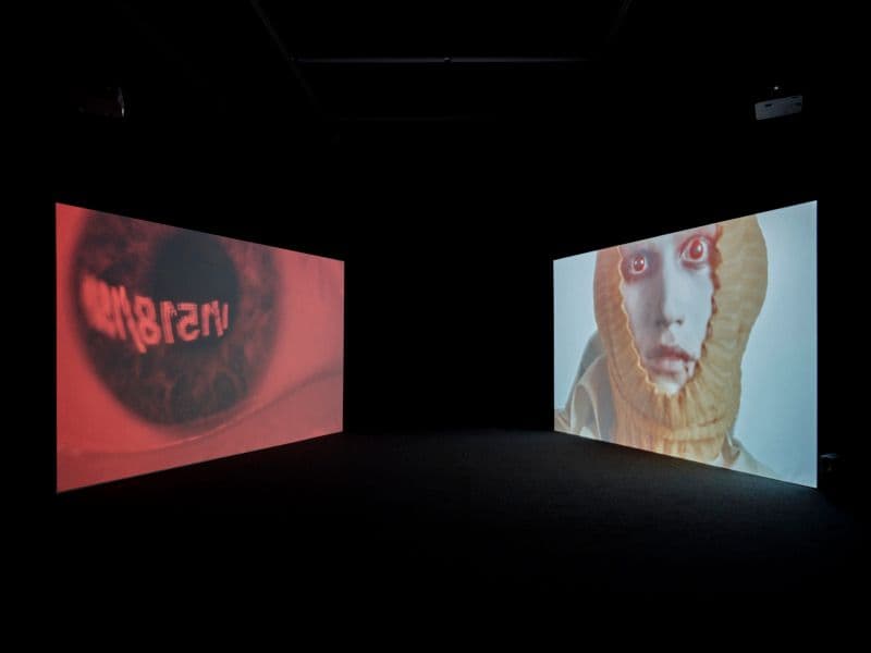 Installation view: Dorota Gawęda & Eglė Kulbokaitė: Mouthless Part III, 2023, two channel video (29:00 min). photo: Norbert Miguletz